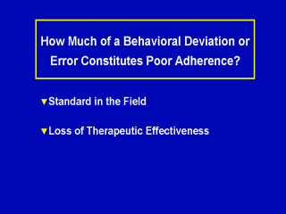 The issue we still confront that we really don't know very much about is how much of a behavioral deviation or error should we consider a poor adherence problem and how much is really tolerable for the individual patient? The standard in the field for research has been that if a person is less than 80% adherent, they're a poor adherer, and if they're more than 80% adherent, they're a good adherer. That was based on the very first randomized controlled intervention study that was done by Brian King in the mid 1970's, where they actually looked at patients who were on diuretics, looked at their adherence levels by pill count, and looked at their blood pressure. They said for those people that were taking less than 80% of their medicine, they did not affect their blood pressure response; for those taking more than 80% they did. So they used an 80% criterion, and that has been standard in the field since then. There's only one other database standard and that is based on the lipids clinic program, which found that 70% adherence to the standard is the degree of cholesterol lowering, and in fact there was sort of a linear relationship between cholesterol lowering and the adherence to that particular pill. But just don’t know for most treatments the amount of adherence necessary to have a desirable clinical outcome.