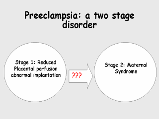 | This looks like we know something with a model like that, but there’s this big black arrow that we have no idea about. But it’s a reasonably good story. It has three or four loops in it. But most of the emphasis in research for us over the last ten years has been on trying to identify the linkage between the two stages of preeclampsia. What’s in this arrow? |