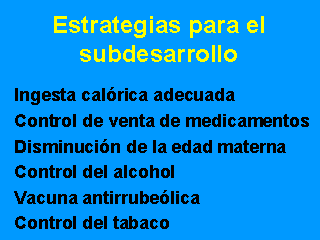 En el subdesarrollo, una ingesta calórica adecuada, control del tabaco y control de las ventas de medicamentos, deben ser agregados a la lista dada para el desarrollo. Como las poblaciones subderarrolladas tienen un control menor de las agresiones ecológicas, los riesgos ambientales para el feto adquieren aquí mayor importancia.