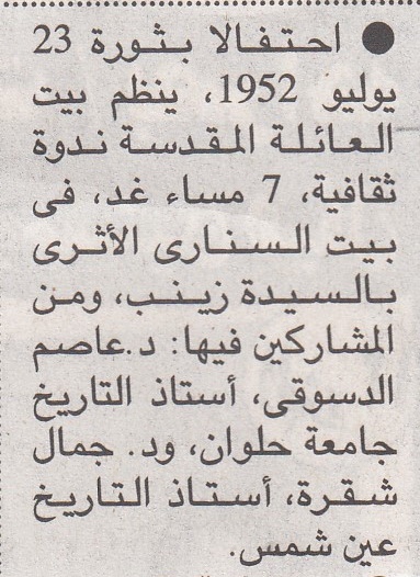 13 يوليه 2024 ينظم بيت العائلة المقدسة ندوة ثقافية احتفالا بثورة 23 يوليو 1952 في بيت السنارى الأهرام