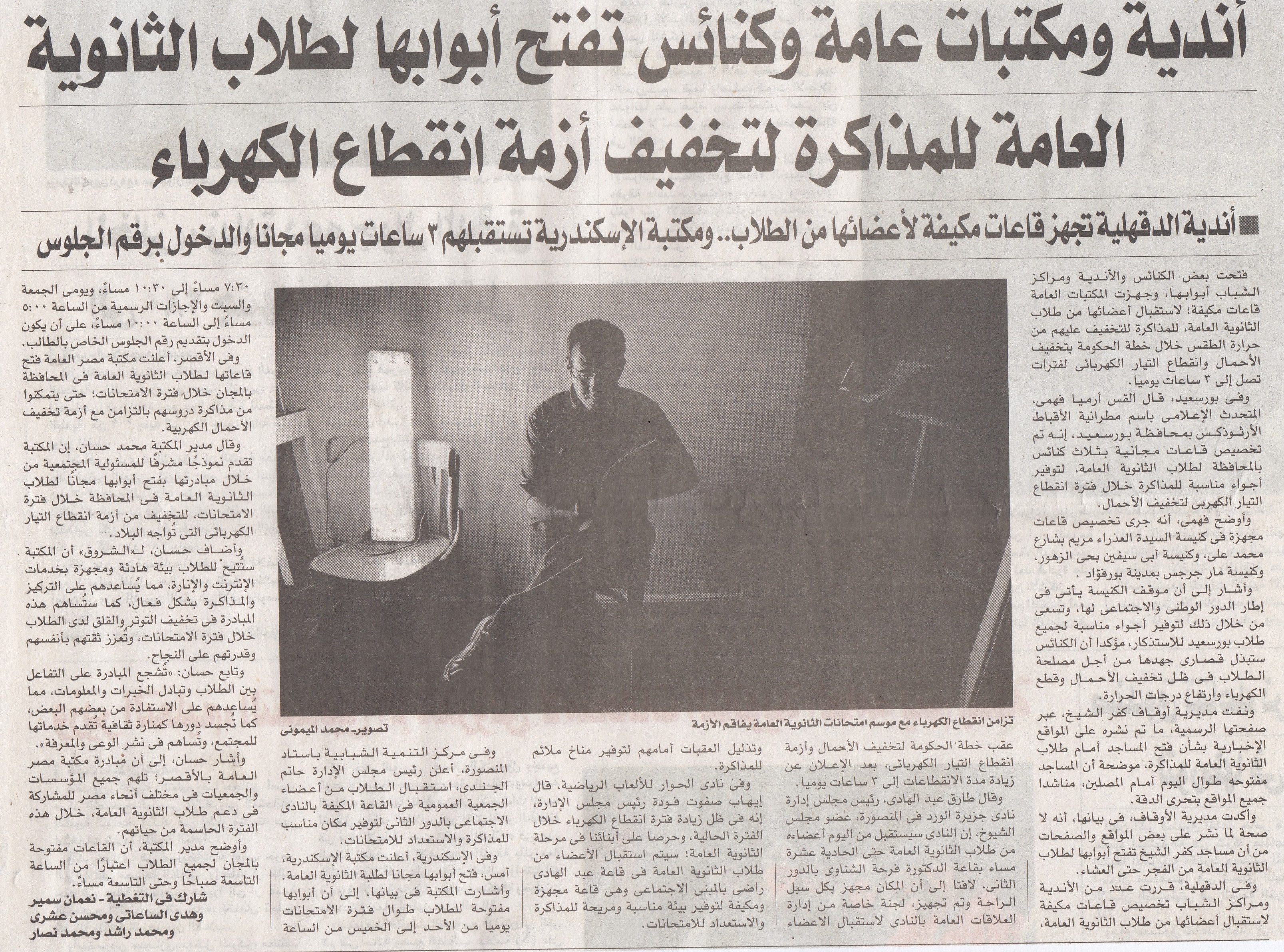 27 يونيو 2024 أندية و مكتبات عامة و كنائس تفتح أبوابها لطلاب الثانوية العامة للمذاكرة لتخفيف أزمة انقطاع الكهرباء الشروق