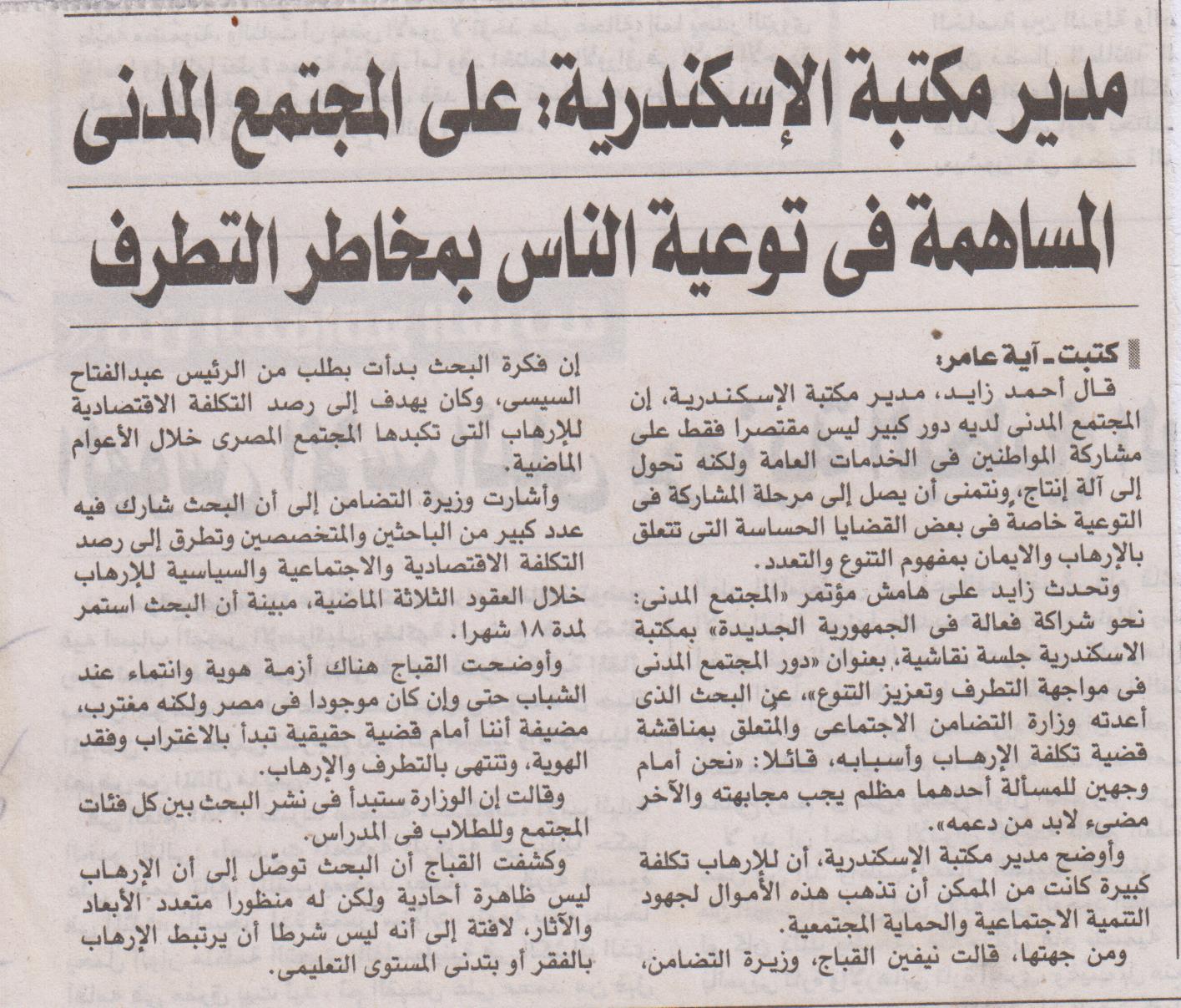 مدير مكتبة الإسكندرية: على المجتمع المدني المساهمة في توعية الناس بمخاطر التطرف