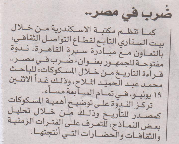 ندوة بعنوان "ضرب في مصر .. قراءة التاريخ من خلال المسكوكات"