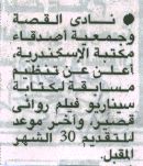 24 أغسطس 2025 نادي القصة وجمعية أصدقاء مكتبة الإسكندرية، أعلن عن تنظيم مسابقة لكتابة سيناريو فيلم روائي قصير الأهرام