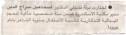 18 يوليه 2004 اختارت دولة تشيلى الدكتور اسماعيل سراج الدين ضمن مئة شخصية عالمية لمنحهم الميدالية التذكارية الحياة