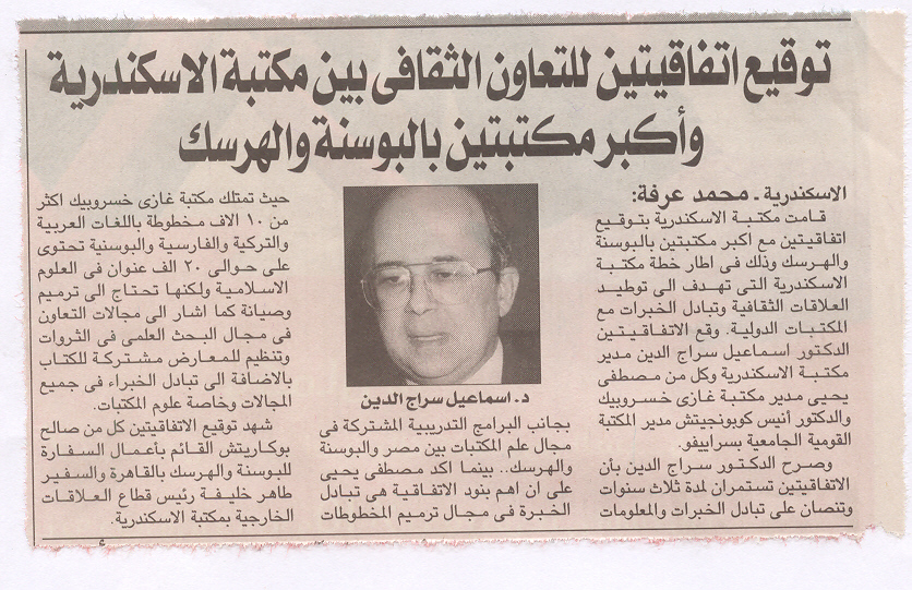 13 يوليه 2004 توقيع اتفاقيتين للتعاون الثقافى بين مكتبة الاسكندرية واكبر مكتبتى بالبوسنة والهرسك الأخبار