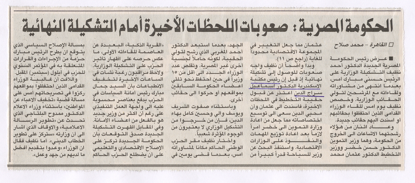 الحكومة المصرية: صعوبات اللحظات الاخيرة امام التشكيلية النهائية