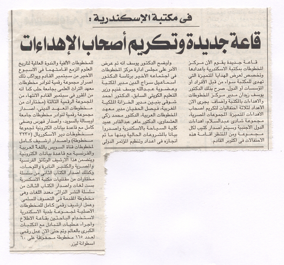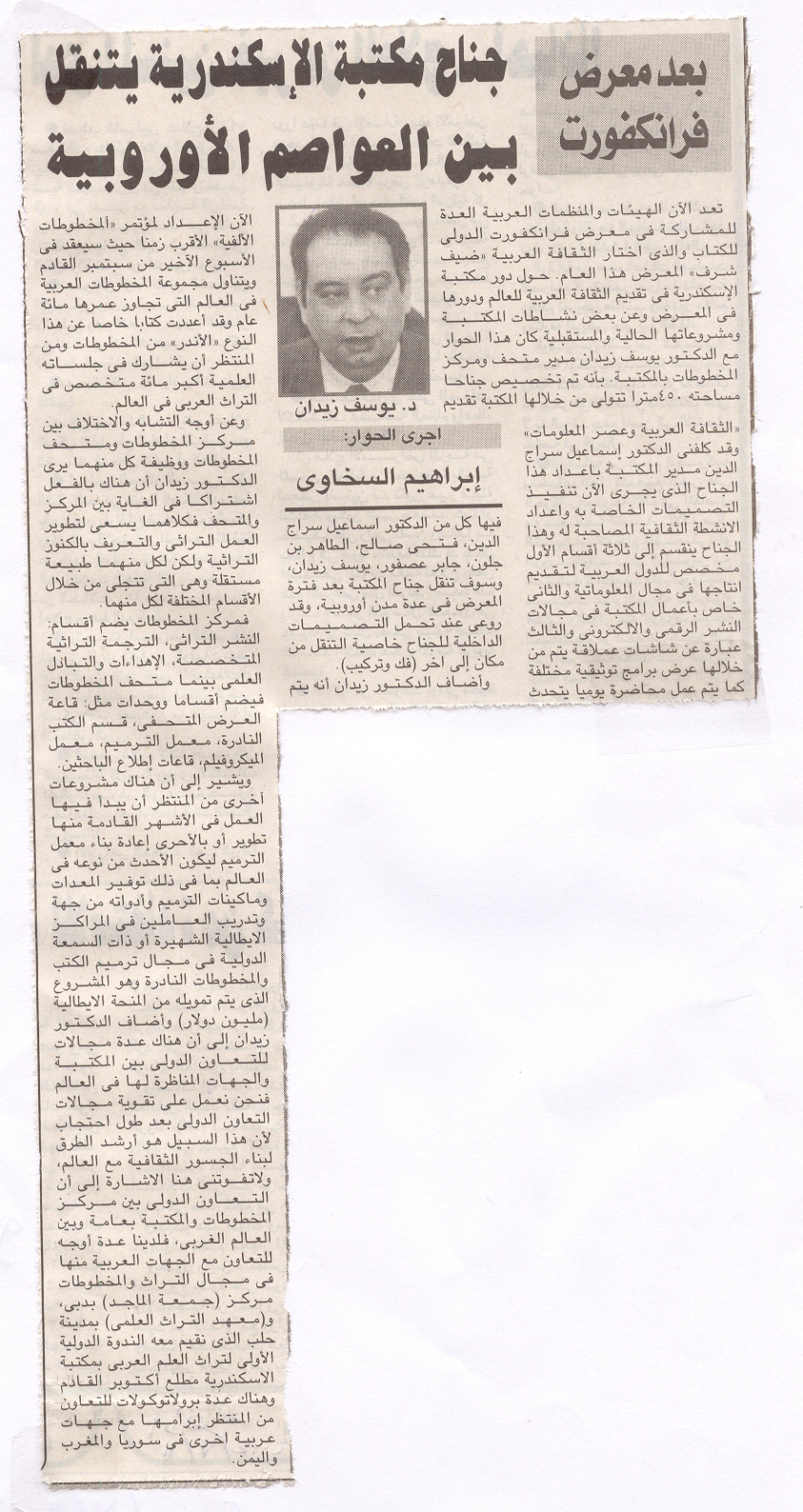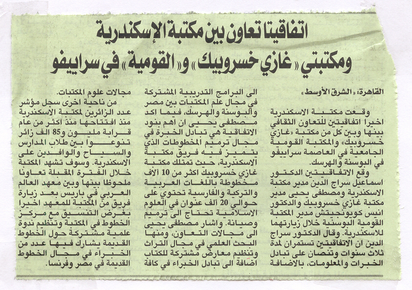 10 يوليه 2004 اتفاقيتا تعاون بين مكتبة الاسكندرية ومكتبتى غازى خسرويك والقومية فى سراييفو الشرق الأوسط