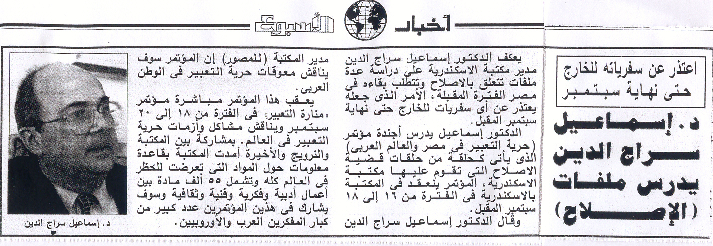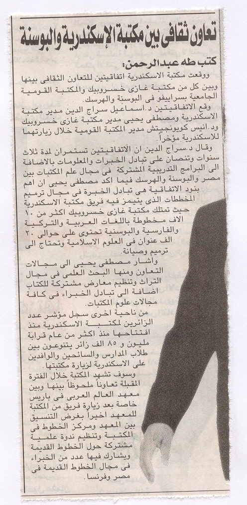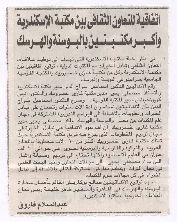 09 يوليه 2004 اتفاقية للتعاون الثقافى بين مكتبة الاسكندرية واكبر مكتبتين بالبوسنة والهرسك الأهرام المسائي