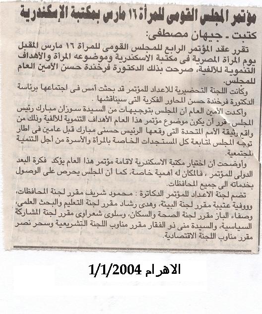 01 يناير 2004 مؤتمرالمجلس القومى للمراة 16 مارس بمكتبة الاسكندرية مؤتمر المجلس القومى للمراة 16 مارس بمكتبة الاسكندرية الأهرام