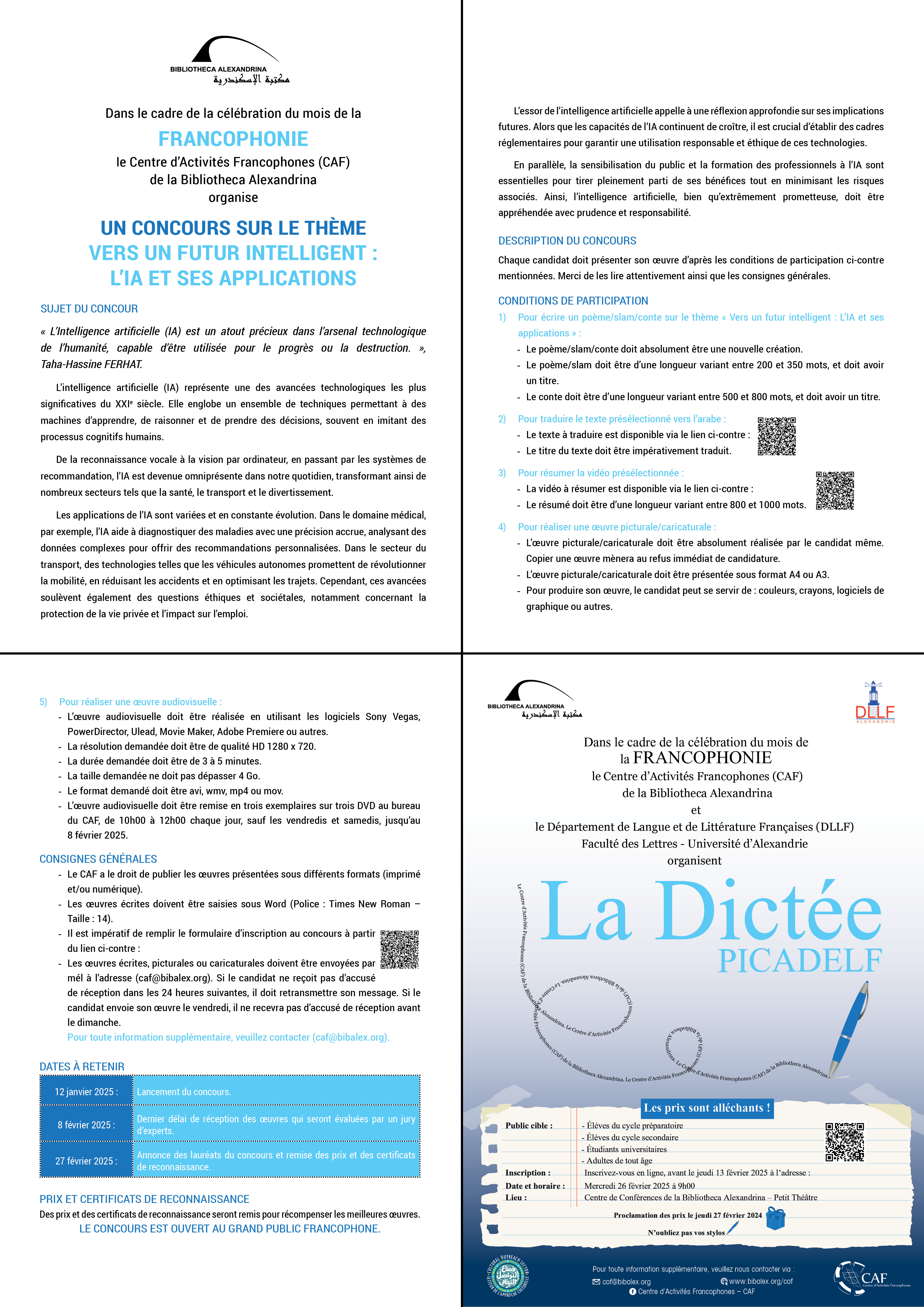 Dans le cadre de la célébration du mois de la FRANCOPHONIE, le Centre d’Activités Francophones (CAF) de la Bibliotheca Alexandrina organise UN CONCOURS SUR LE THÈME : VERS UN FUTUR INTELLIGENT : L'IA ET SES APPLICATIONS.