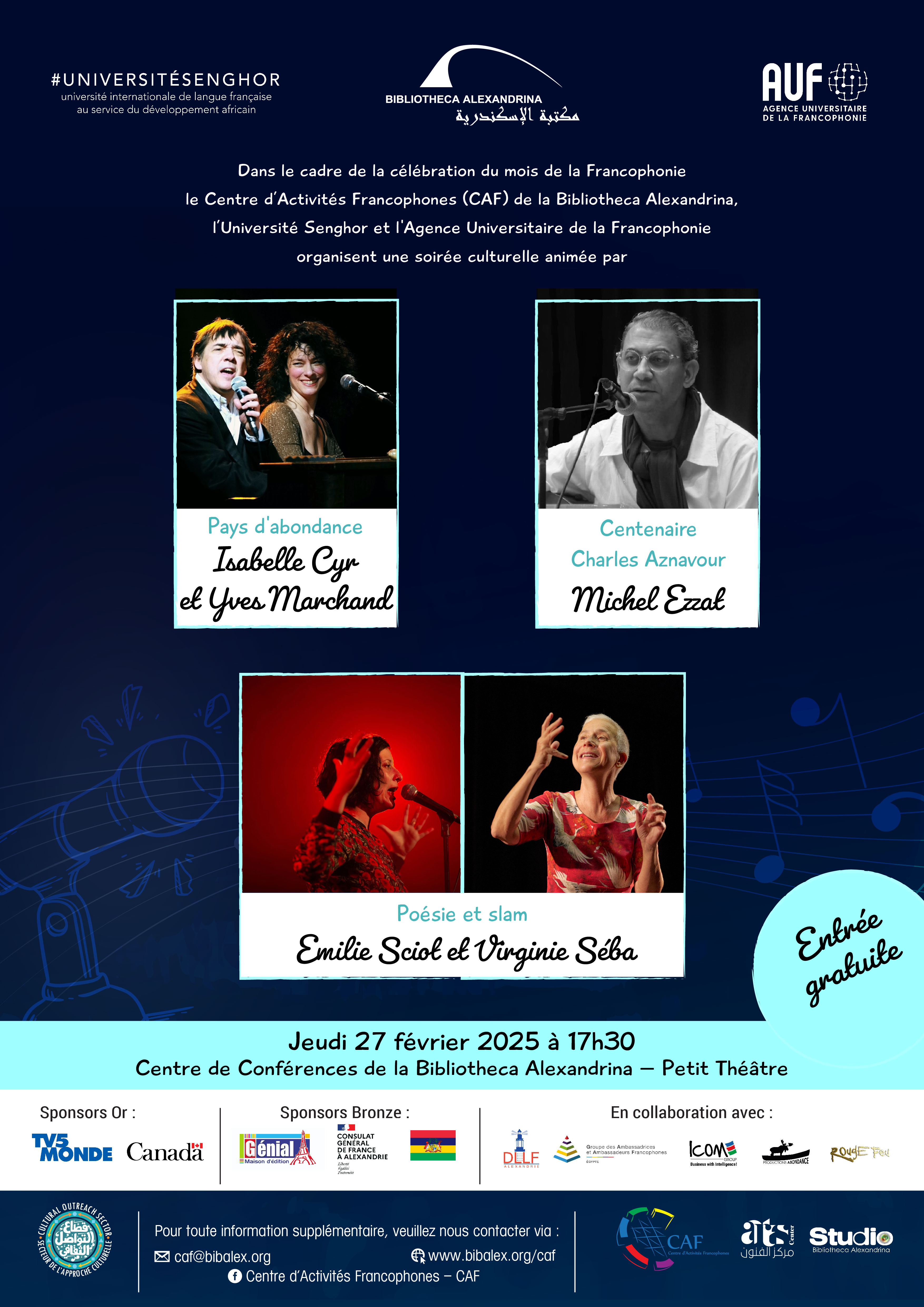 l’Université Senghor à Alexandrie et l'Agence Universitaire de la Francophonie organisent une soirée culturelle animée par :