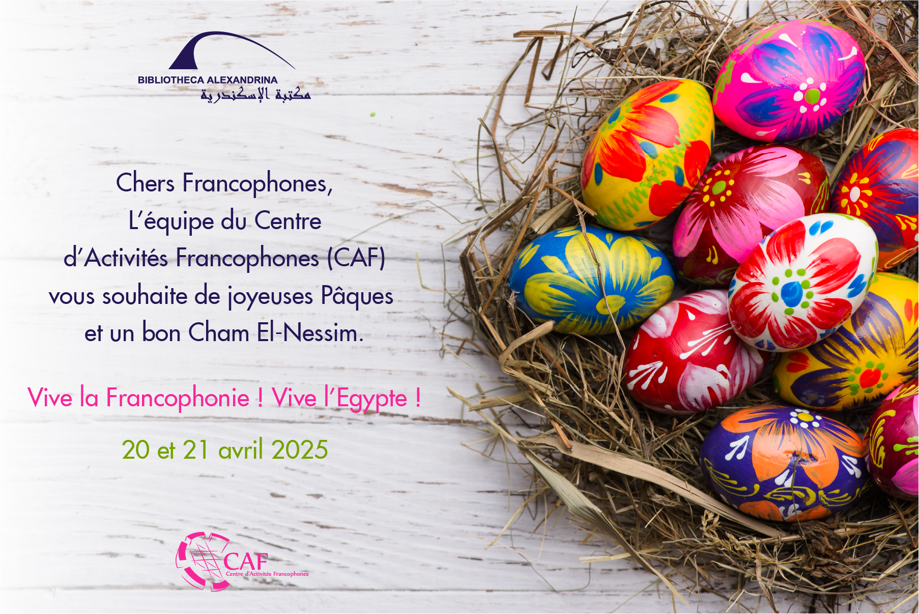 L’équipe du Centre d’Activités Francophones (CAF) vous souhaite de joyeuses Pâques et un bon Cham El-Nessim.