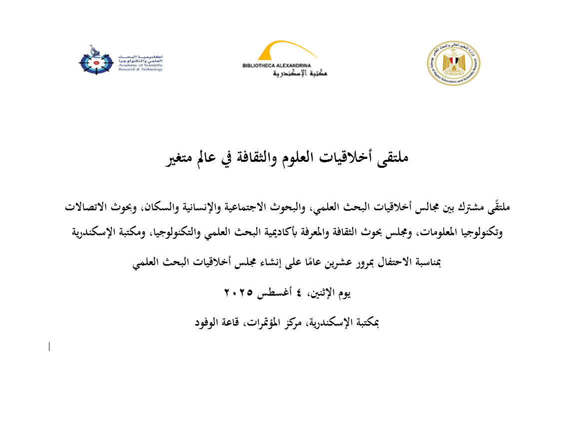 ملتقًى مشترك بين مجالس أخلاقيات البحث العلمي، والبحوث الاجتماعية والإنسانية والسكان، وبحوث الاتصالات وتكنولوجيا المعلومات، ومجلس بحوث الثقافة والمعرفة بأكاديمية البحث العلمي والتكنولوجيا، ومكتبة الإسكندرية بمناسبة الاحتفال بمرور عشرين عامًا على إنشاء مجلس أخلاقيات البحث العلمي يوم الإثنين، 4 أغسطس 2025 بمكتبة الإسكندرية، مركز المؤتمرات، قاعة الوفود