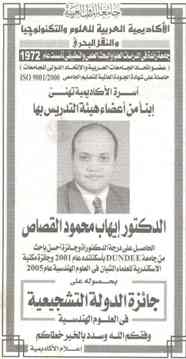 الدكتور إيهاب القصاص حاصل علي درجة الدكتوراه من جامعة داندى بأسكتلندة وهو حاليا من أعضاء هيئة التدريس بالأكاديمية العربية للعلوم والتكنولوجيا والنقل البحري