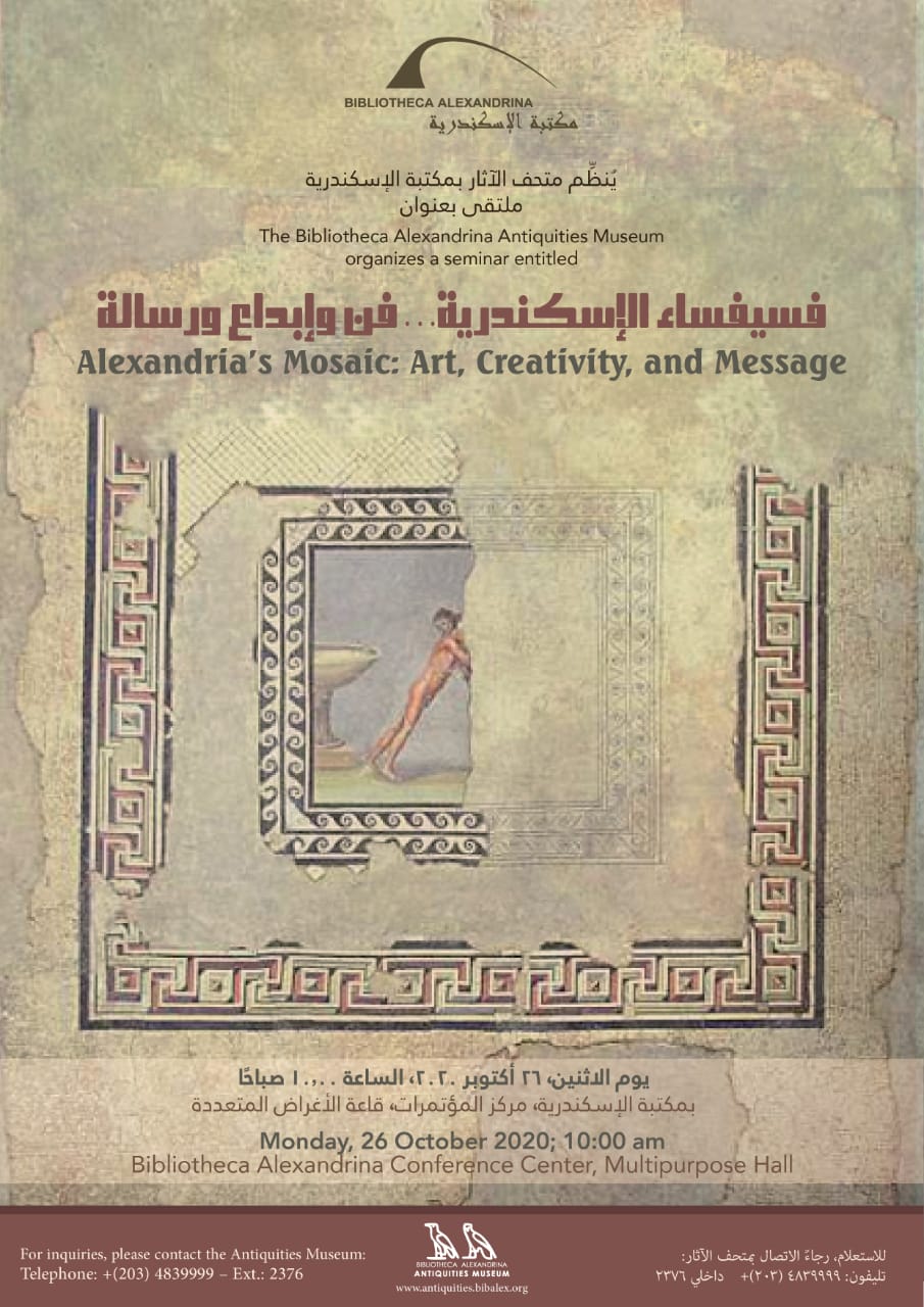 Le Musée des Antiquités, affilié au Secteur de l’Approche Culturelle de la BA, organise un forum intitulé : « La mosaïque d'Alexandrie : un message d'art et de créativité », le lundi 26 octobre 2020 à 10h00, au Centre de Conférences de la BA, à la Salle à Usages Multiples.