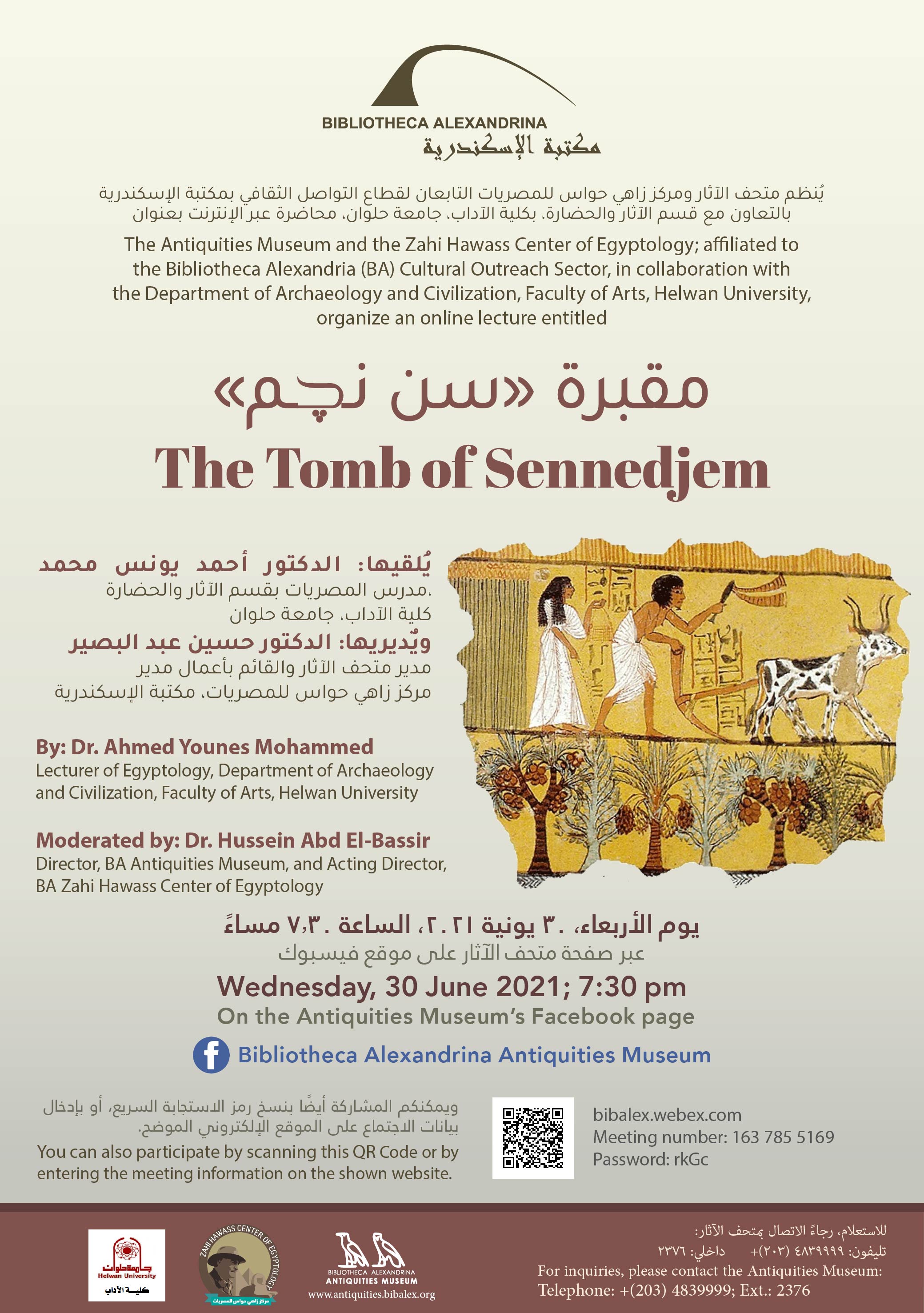 Le Musée des Antiquités et le Centre d’Egyptologie Zahi Hawass de la BA, en coopération avec le Département d’Archéologie et de Civilisation, de la Faculté des Arts, de l’Université de Helwan, organise une conférence en ligne intitulé : « Le tombeau de Sennedjem ». Elle sera animée par Dr Ahmed Younis Mohamed, maître de conférences en égyptologie au Département d’Archéologie et de Civilisation, à la Faculté des Arts, de l’Université de Helwan, le mercredi 30 juin 2021, à 19h30, via la page Facebook du Musée des Antiquités de la BA.