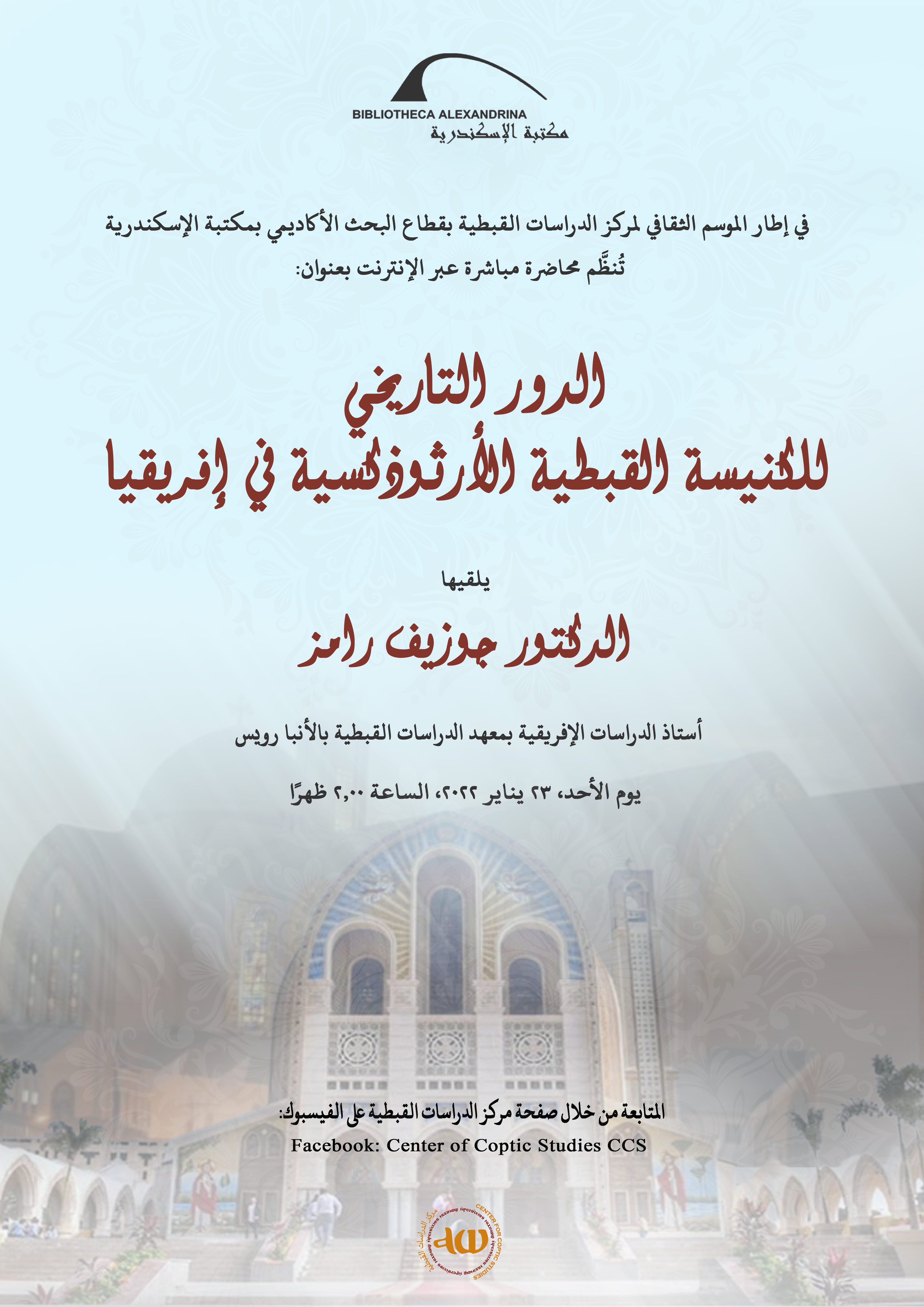 Le Centre des Etudes Coptes de la BA organise la deuxième conférence de sa 12e saison culturelle intitulée : « Le Rôle Historique de l’Eglise Orthodoxe Copte en Afrique ». Elle sera animée par Dr Joseph Ramez, professeur d’études africaines, à l’Institut des Etudes Coptes. La conférence aura lieu en ligne, le dimanche 23 janvier 2022, à 14h00.