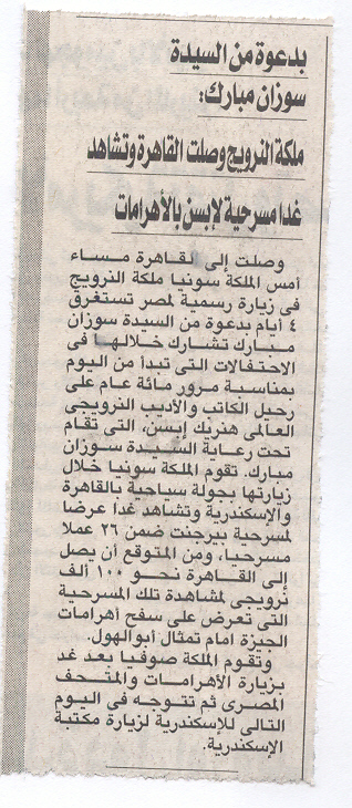 26 oct. 2006 La reine de Norvège est arrivée au Caire et assistera à la représentation d'Ibsen aux Pyramides Ahram Massai
