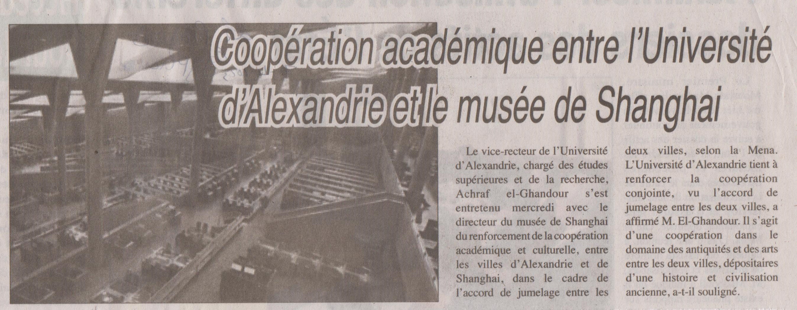 07 avr. 2023 Coopération académique entre l'Université d'Alexandrie et le musée de Shanghai Le Progrès Egyptien