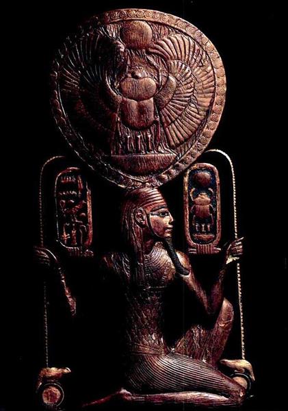 غطاء مرآة الملك توت عنخ آمون مصنوعة من الخشب على هيئة الإله "حح" إله الأبدية