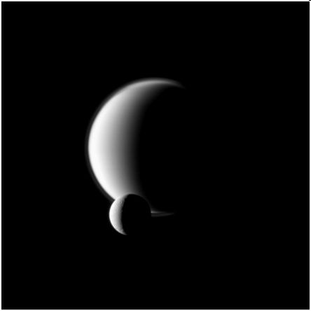 يمتلك كوكب زحل العملاق نظامًا كبيرًا من الأقمار، والصورة تعد مثالاً لظواهر ديناميكية مثيرة، تحدث في نظام أقمار زحل، وهذه الظواهر تمكن العلماء من تدقيق حساباتهم وتطوير فهمهم لخصائص مدارات أقمار زحل. لمزيد من المعلومات، نرجو زيارة الصفحة التالية على شبكة الإنترنت:-