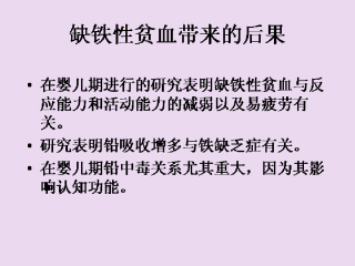 一些已经完成并发表的研究表明铁缺乏和缺铁性贫血对精神运动的发育和能力有影响。在婴儿期进行的研究表明缺铁性贫血与反应能力和活动能力的减弱以及易疲劳有关。还有研究表明铅吸收增多与铁缺乏症有关,这是由于铁缺乏患者铁的吸收增加,使得其它金属的吸收变得容易。在婴儿期铅中毒关系尤其重大,因为其影响认知功能。