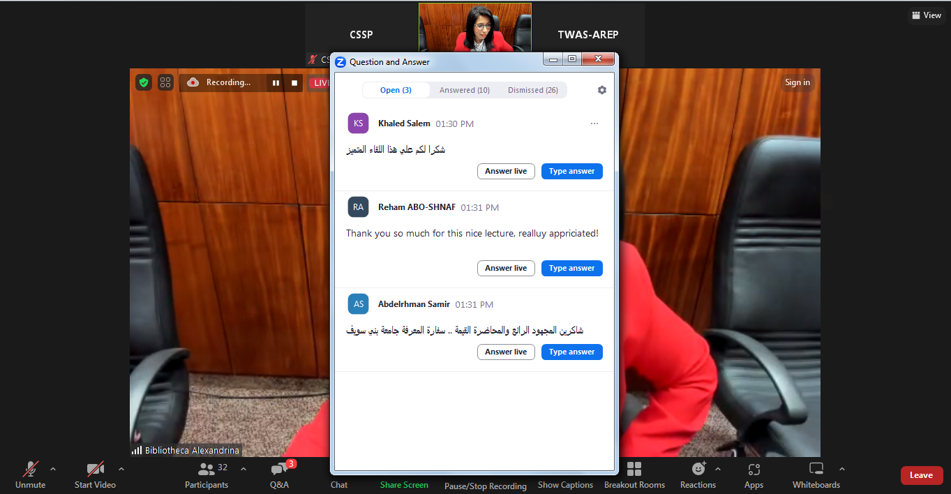 The Bibliotheca Alexandrina (BA), through the Center for Special Studies and Programs (CSSP) and The World Academy of Sciences for the Advancement of Science in Developing Countries’ Arab Regional Partner (TWAS–AREP) organized an online lecture titled “On the Interplay of Data Sciences and Earth Observation Addressing Environmental Challenges in the Arab Region”; by Prof. Hesham ElAskary, Professor of Remote Sensing and Earth System Science, Schmid College of Science and Technology (USA). The lecture was moderated by H.E. Prof. Amr Ezzat Salama, Former Minister of Higher Education and Scientific Research, on Monday, 27 November 2023, 12:00 noon (Cairo time).