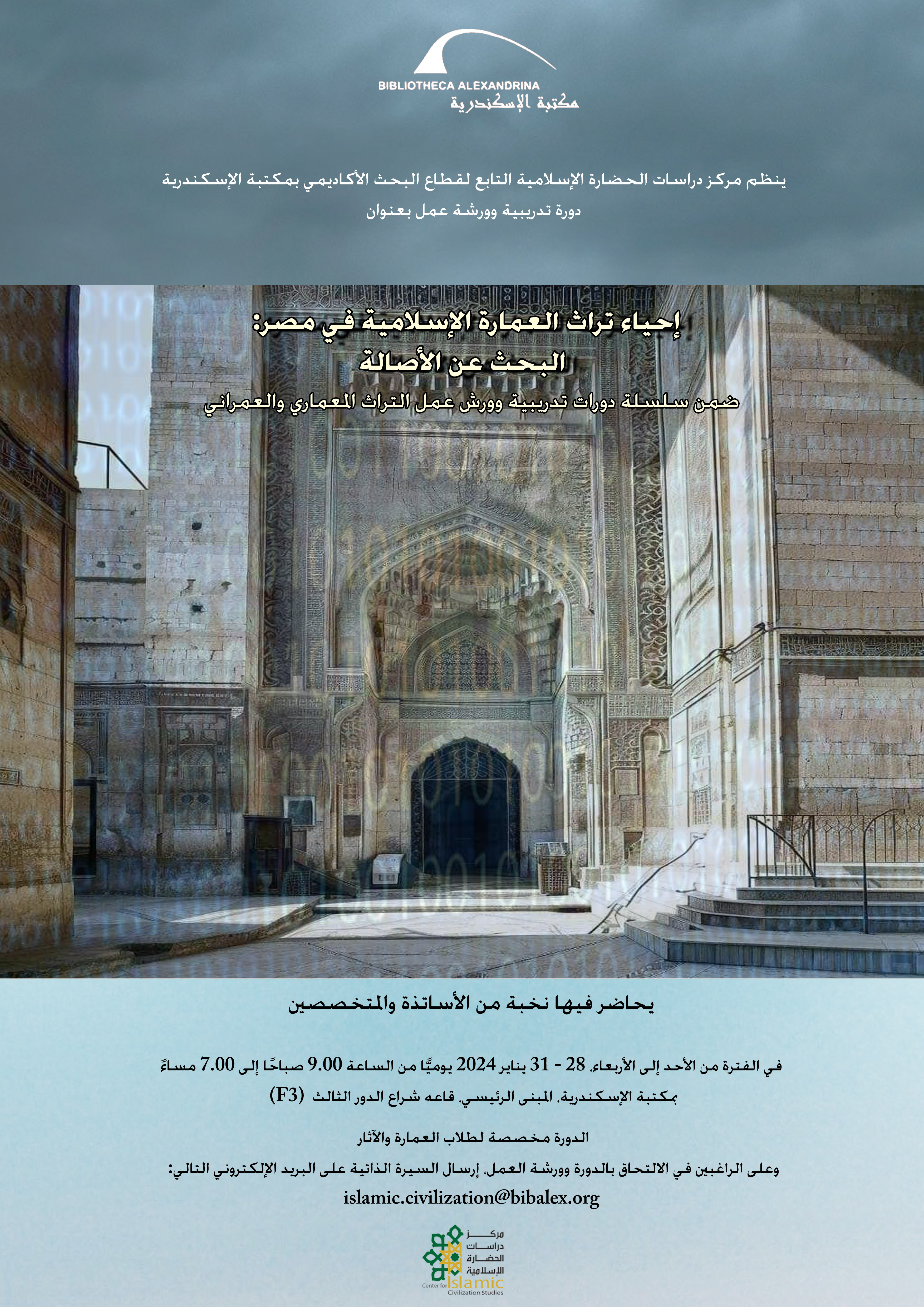 تنظم مكتبة الإسكندرية من خلال مركز دراسات الحضارة الإسلامية، دورة تدريبية وورشة عمل "إحياء تراث العمارة الإسلامية في مصر: البحث عن الأصالة"، ضمن سلسلة دورات تدريبية وورش عمل التراث المعماري والعمراني، والتي يحاضر فيها نخبة من الأساتذة والمتخصصين.