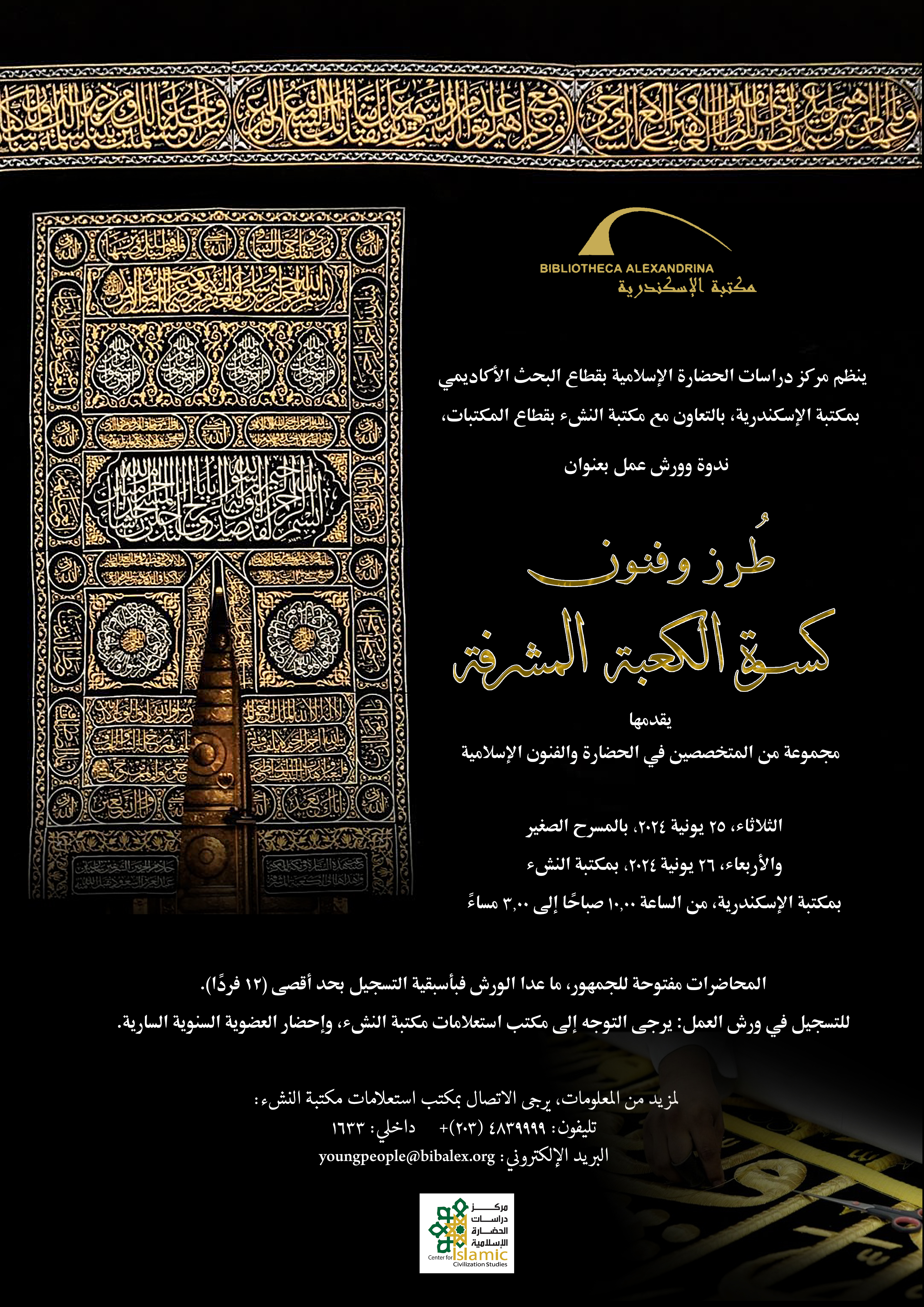 ينظم مركز دراسات الحضارة الإسلامية بقطاع البحث الأكاديمي بمكتبة الإسكندرية، بالتعاون مع مكتبة النشء بقطاع المكتبات ندوة وورش عمل بعنوان ’’طرز وفنون كسوة الكعبة المشرفة‘‘ يقدمها مجموعة من المتخصصين في الحضارة والفنون الإسلامية، يوم الثلاثاء 25 يونية 2024 بالمسرح الصغير، ويوم الأربعاء 26 يونية 2024 بمكتبة النشء بمكتبة الإسكندرية، من الساعة 10٫۰۰ صباحًا إلى 3٫۰۰ مساءً.