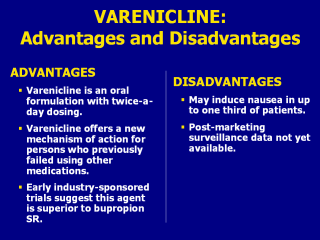 following: Varenicline is an oral formulation (twice-a-day dosing) that is easy to use. Varenicline offers a new mechanism of action for persons who previously failed using other medications. Early industry-sponsored trials suggest this agent is superior to bupropion SR. Disadvantages of varenicline include the following: The drug may induce nausea in up to one third of patients. Slide is used with permission, Rx for Change: Clinician-Assisted Tobacco Cessation. Copyright © 1999-2007 The Regents of the University of California, University of Southern California, and Western University of Health Sciences. All rights reserved. |