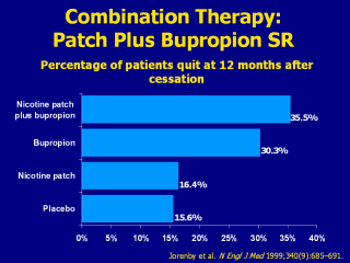 and nicotine patch plus bupropion SR. The results indicated that cessation rates associated with a combination of the patch and bupropion SR were significantly higher than those in the patch and placebo groups. Addition of the patch to bupropion SR increased cessation rates by 5.2 percentage points, but this increase was not statistically significant. Jorenby et al. N Engl J Med 1999;340(9):685–691. |