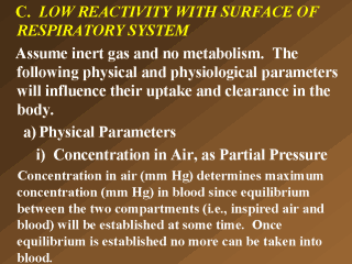 Blood/Air Solubility Coefficient, S Knowing S gives the maximum concentration in moles or milligrams/Liter of blood which can be achieved at equilibrium, i.e. it will be the concentration in air (mg/L) x S. Substances with high S values (methanol, ethanol, acetone, ether, etc.) will take a long time to reach equilibrium between inspired air and blood. Substances with low S values (methane, nitrous oxide, etc.) will reach equilibrium between inspired air and blood very quickly. S value can be taken for water at 37oC but be careful (see above). iii) Oil/Water Partition Coefficient This will influence the time to reach equilibrium between inspired air and blood in that if the chemical is highly fat soluble the chemical will be extracted from blood. However, fatty tissue is poorly perfused. |