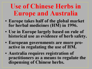 differently than any other herbal medicines. In some ways, European governments are more proactive in regulating the use of herbal medicines. Even back in 1978, Germany already established an expert committee, called the Commission E, to evaluate the safety and efficacy of all herbal combinations sold in that country (Karch, 1999). In France, licensing and approval are required for the use of some 200 traditional herbal medicines. In England, a database of adverse effects of nonconventional medicines has been established at the National Poisons Unit to monitor the safe use of herbal remedies. At present, about 600 to 800 raw medicinal substances are imported for use in Australia, principally from China. In light of such a rapid growing use, the Victorian Parliament in Australia recently passed the Chinese Medicine Registration Act of 2000 (effective January, 2002) in an effort to regulate the advertising of Chinese medicines and the dispensing of Chinese herbs. |