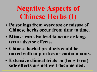 (Leung, 1984). Like all other drugs, in addition to poisoning from overdose, the abuse or misuse of Chinese herbs can result in acute but particularly long-term (sometimes subtle) side effects. This is indeed the bad side of Chinese herbs. It is intuitive that some side effects can result from the long-term use of certain Chinese herbs, in that some (small amounts of) harmful impurities are bound to be present in these herbal products. As reflected in an editorial (Angell and Kassirer, 1998) and the Dietary Supplement Health and Education Act passed by the U.S. Congress in 1994, most herbal preparations are untested and unregulated in North America (and elsewhere). Chinese herbal products thus could be mixed with impurities or environmental contaminants. Some herbs could even have been treated with pesticides during their cultivation. Furthermore, extensive clinical trials, if any, on any particular herbal remedy for long-term side effects are either rare or not well documented (e.g., Chan, 1997), despite the claim that these remedies have been time-tested to be safe. |