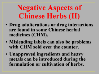 herbs used were not given (e.g., Wong et al., 1999). Chinese patent medicines typically contain several active ingredients including primarily herbs, animal parts, and minerals. These patent products are usually formulated into pills, tablets, powders, or liquids for ease of use. Heavy metals or unapproved ingredients thus could be introduced into some of these medicines during formulation. In some cases, pharmaceutical adulterants were found added to enhance or speed up treatment efficacy. Arsenic, cadmium, lead, and mercury are the heavy metals often found in some CHM. These contaminants might have come from pesticide applications during cultivation of herbs, from soil, or from processing machinery used in manufacturing plants (e.g., Dharmananda, 2002; Espinoza et al., 1995; Fratkin, 1997; Kang-Yum and Oransky, 1992; McCormick, 2000). Drugs like aminopyrine, caffeine, ibuprofen, and salicylamide are some of the adulterants found in some CHM used for treatment of asthma, back pain, or arthritis (e.g., Fratkin, 1997; Huang et al., 1997; Ries and Sahud, 1975). |