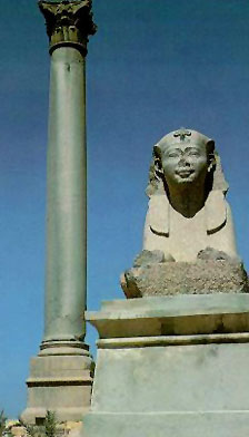 An approximately 25m red Aswan granite column with a circumference of 9m, was constructed in honor of the Emperor Diocletain. Originally from the temple of the Serapis, it was once a magnificent structure rivaling the Soma and the Caesareum. Nearby are subterranean galleries where sacred Apis bulls were buried, and three sphinxes. After his defeat by Julius Caesar in the civil war, Pompey fled to Egypt where he was murdered in 48 BC; mediaeval travelers later believed he must be buried here, and that the capital atop the corner served as a container for his head. In fact, the pillar was raised in honor of Diocletain at the very end of the 4th century. Diocletain captured Alexandria after it had been under siege. The Arabs called it "Amoud el-Sawari", Column of the Horsemen. The Pillar is the tallest ancient monument in Alexandria .