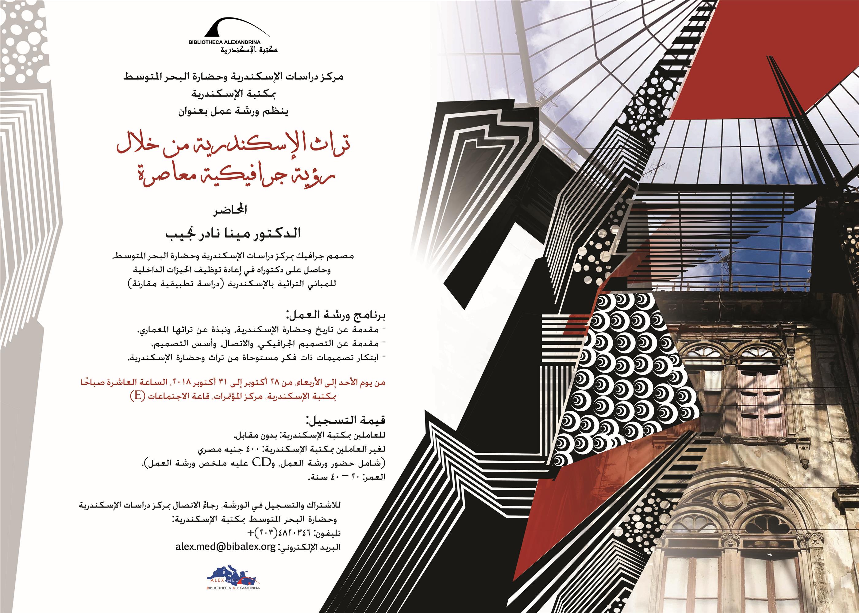 ينظم مركز دراسات الإسكندرية وحضارة البحر المتوسط بمكتبة الإسكندرية ورشة عمل بعنوان: "تراث الإسكندرية من خلال رؤية جرافيكية معاصرة"، وذلك في الفترة من 28-31 أكتوبر 2018، وتتناول الورشة مقدمة عن تاريخ وحضارة الإسكندرية، ونبذة عن تراثها المعماري، وكذلك مقدمة عن التصميم الجرافيكي، والاتصال، وأسس التصميم، كما تتضمن الورشة أيضًا كيفية ابتكار تصميمات ذات فكر مستوحاة من تراث وحضارة الإسكندرية.