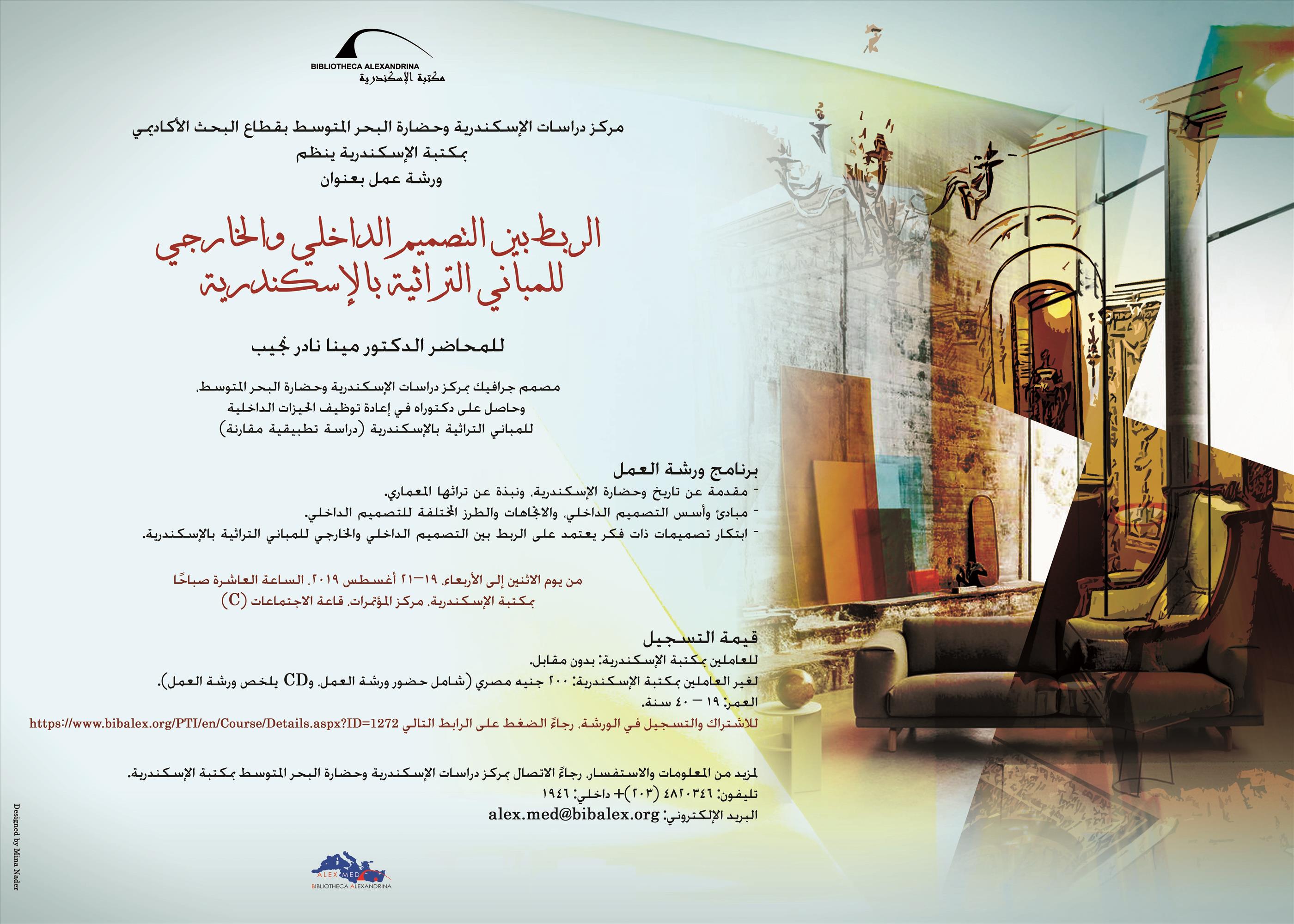 نظم مركز دراسات الإسكندرية وحضارة البحر المتوسط بقطاع البحث الأكاديمي بمكتبة الإسكندرية ورشة عمل بعنوان: "الربط بين التصميم الداخلي والخارجي للمباني التراثية بالإسكندرية"، وذلك في الفترة من 19-21 أغسطس 2019، وتناولت الورشة: