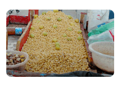 These round yellow beans, boiled and salted, are piled in a mound on a cart, with lemons cut in half arranged around them. They are sold in paper cones and are to be found all along the Corniche. If prepared at home, they may be sprinkled with a bit of chili powder to taste, and cumin to relieve any bloating caused by the bean. Lupine is said to be good for diabetes.