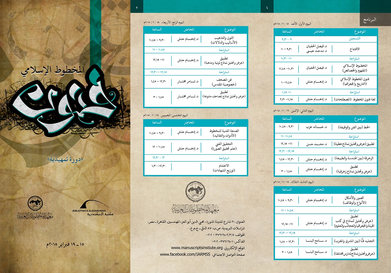 ينظم مركز المخطوطات بمكتبة الإسكندرية، بالتعاون مع معهد المخطوطات العربية بالقاهرة، دورة في فنون المخطوط الإسلامي من 15–19 فبراير 2015 بمكتبة الإسكندرية.