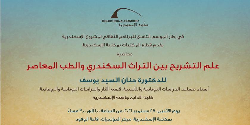في إطار الموسم التاسع للبرنامج الثقافي لمشروع الإسكندرية، يقدم قطاع المكتبات بمكتبة الإسكندرية محاضرة بعنوان " علم التشريح بين التراث السكندري والطب المعاصر"، للدكتورة حنان السيد يوسف، أستاذ مساعد الدراسات اليونانية واللاتينية، بقسم الآثار والدراسات اليونانية والرومانية، بكلية الآداب، جامعة الإسكندرية.
