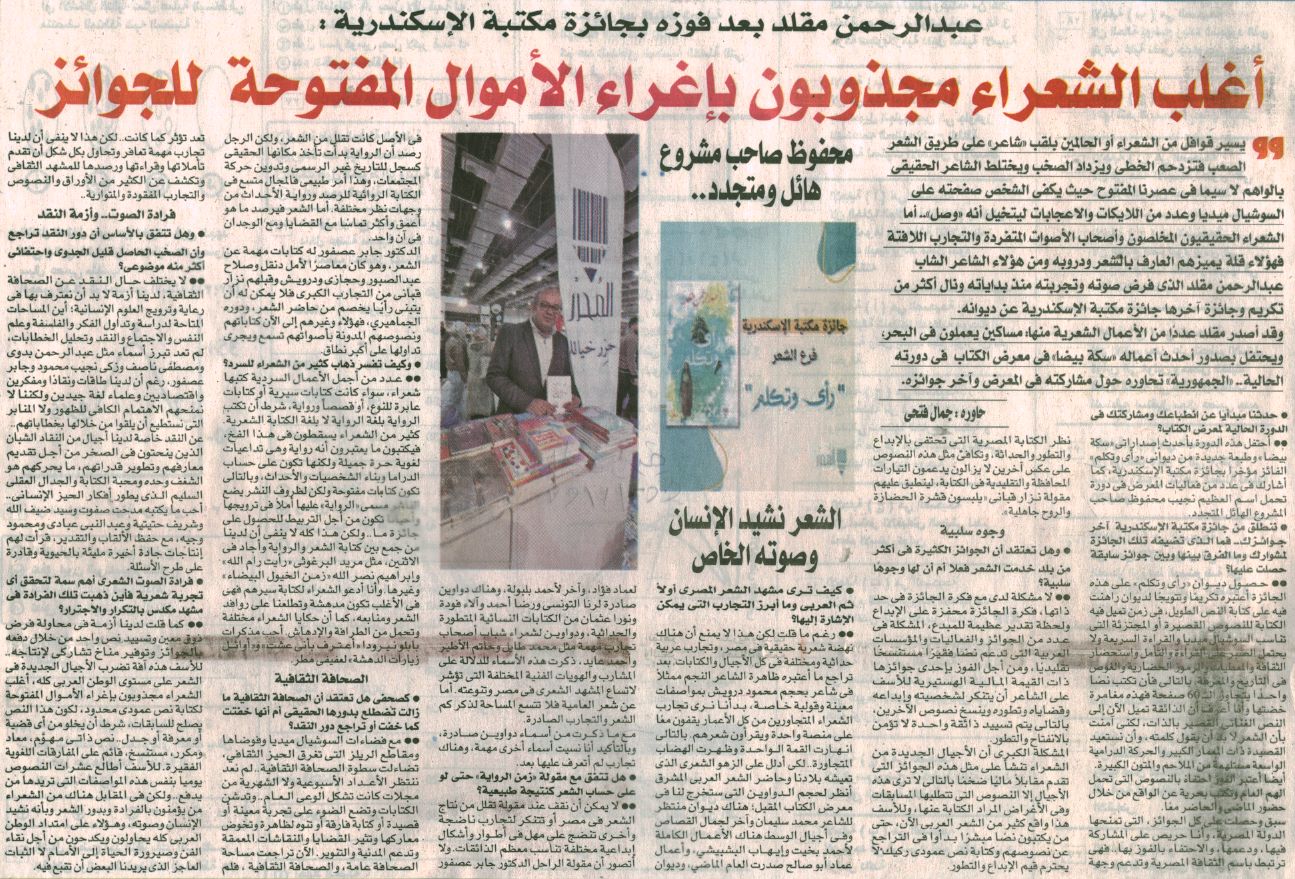 27 يناير 2026 عبد الرحمن مقلد بعد فوزه بجائزة مكتبة الإسكندرية: أغلب الشعراء مجذوبون بإغراء الأموال المفتوحة للجوائز الجمهورية