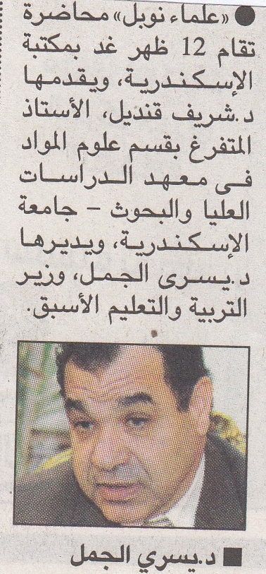 "علماء نوبل" محاضرة تقام بمكتبة الإسكندرية