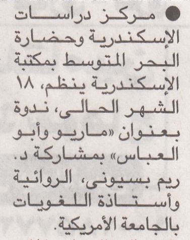 09 أبريل 2024 ندوة بعنوان "ماريو و أبو العباس " بمشاركة د.ريم بسيوني, الروائية و أستاذة اللغويات بالجامعة الأمريكية. الأهرام