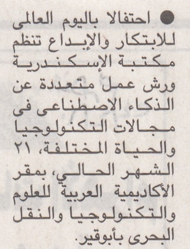 10 أبريل 2024 احتفالا باليوم العالمى للإبتكار و الإبداع تنظم مكتبة الإسكندرية ورش عمل متعددة عن الذكاء الإصطناعي في مجالات التكنولوجيا و الحياة المختلفة. الأهرام