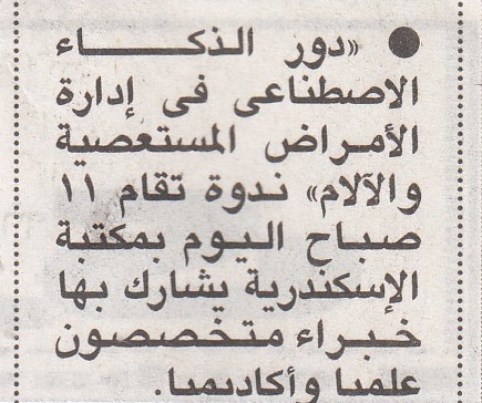 31 يناير 2024 دور الذكاء الاصطناعي في إدارة الأمراض المستعصية و الآلام, ندوة تقام في مكتبة الإسكندرية الأهرام