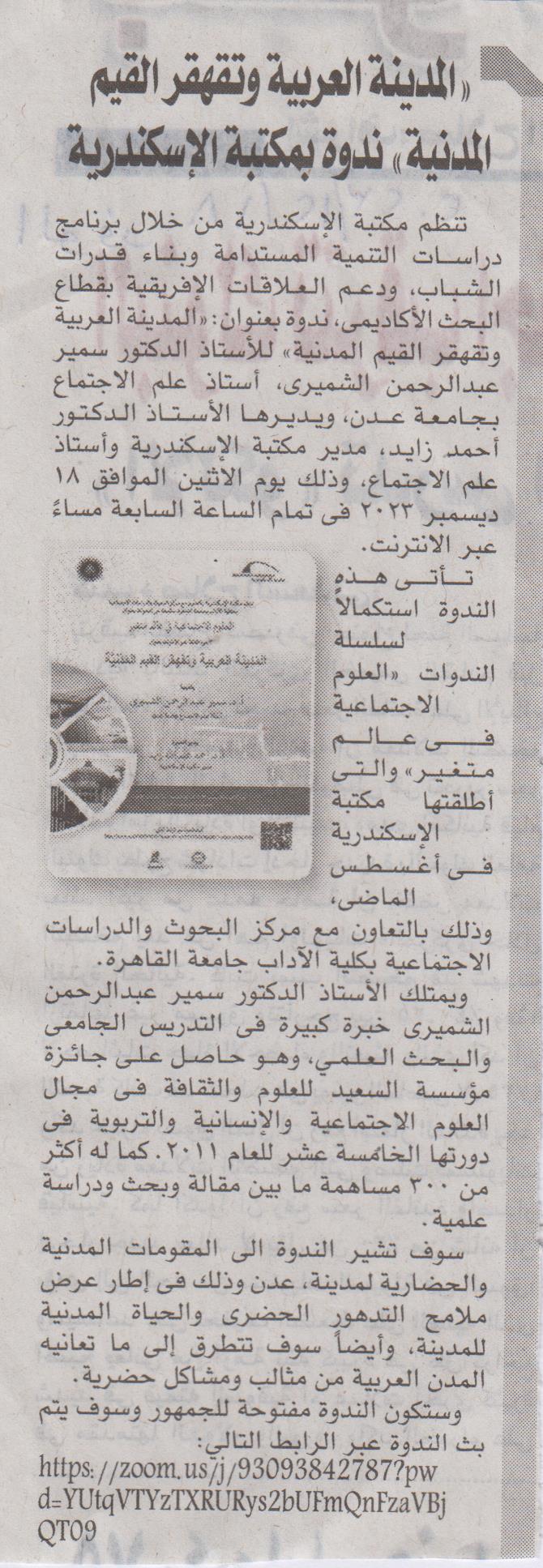"المدينة العربية وتقهقر القيم المدنية" ندوة بمكتبة الإسكندرية