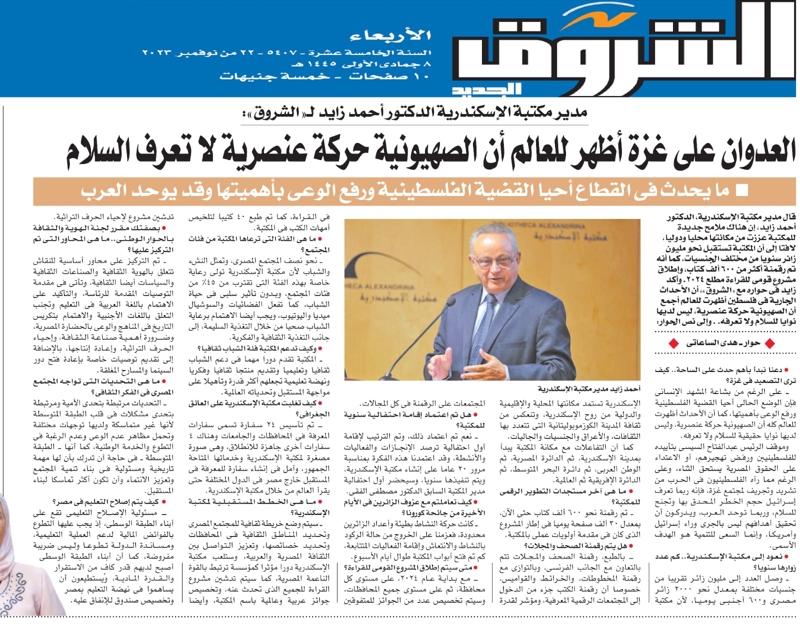 22 نوفمبر 2023 مدير مكتبة الإسكندرية الدكتور احمد زايد لـ "الشروق": العدوان على غزة أظهر للعالم أن الصهيونية حركة عنصرية لا تعرف السلام الشروق