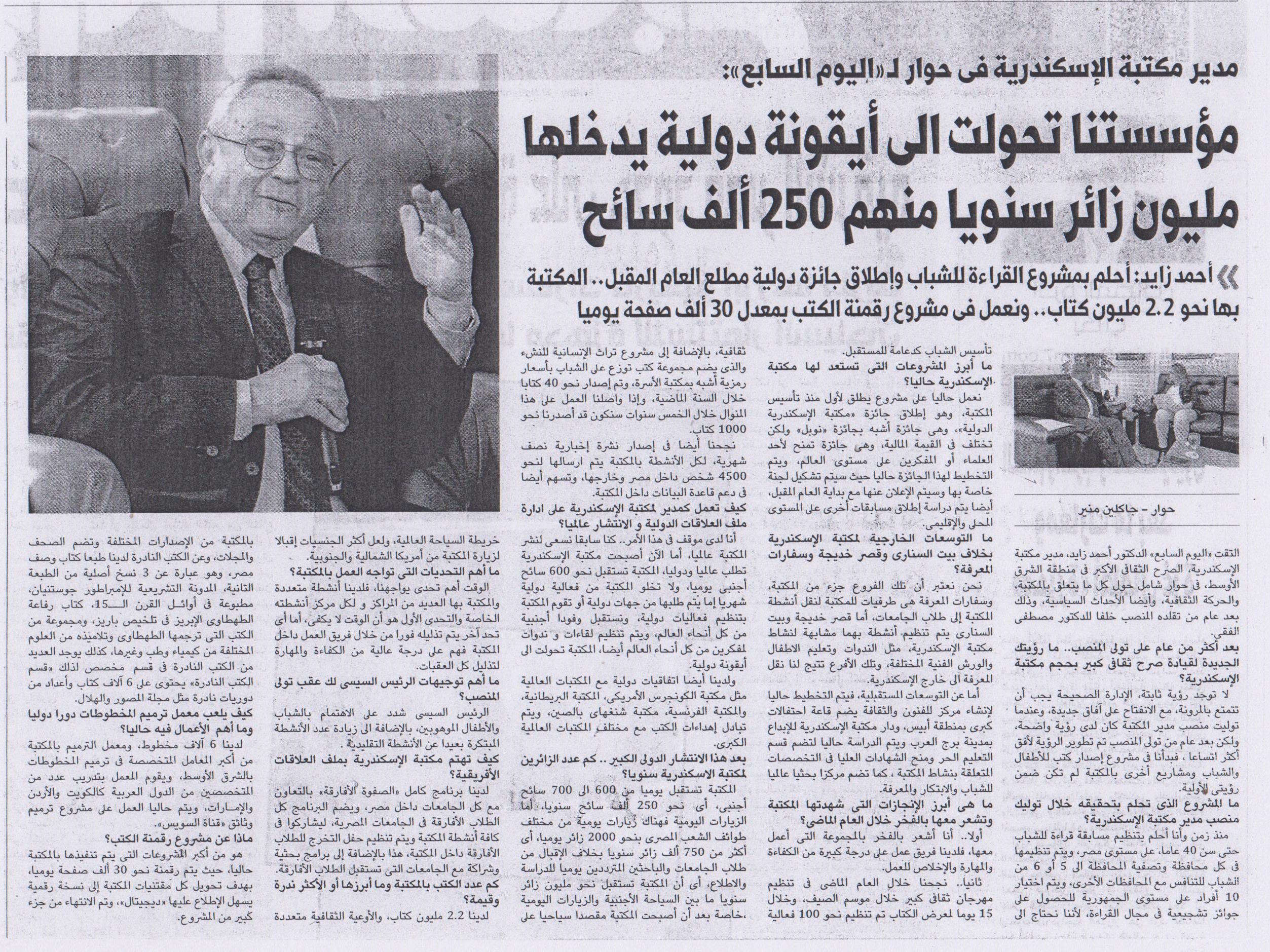 17 نوفمبر 2023 مدير مكتبة الإسكندرية في حوار لـ"اليوم السابع": مؤسستنا تحولت إلى أيقونة دولية يدخلها مليون زائر سنويا منهم 250ألف سائح اليوم السابع